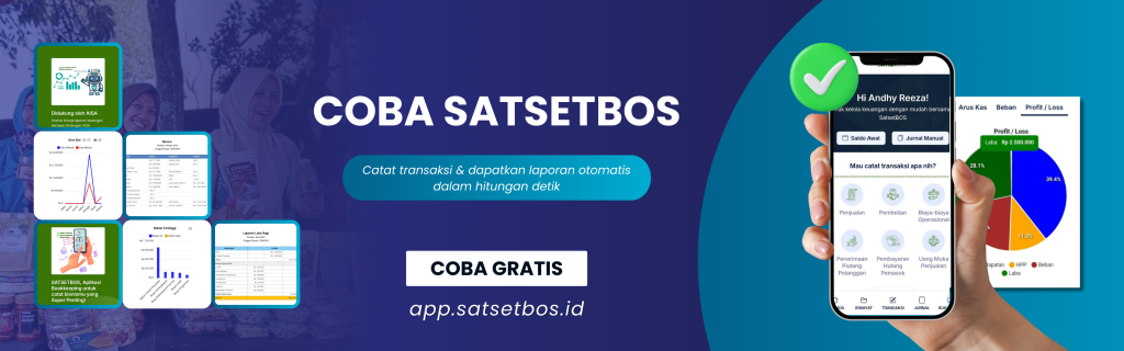 Mulai pembukuan usaha yang lebih rapi dan efisien dengan SATSETBOS. Aplikasi ini dapat diunduh melalui Google Play Store/ App Store dan menawarkan biaya langganan yang sangat terjangkau, hanya sekitar Rp3.000 per hari. Dengan SATSETBOS, pembukuan usaha menjadi lebih mudah, cepat, dan terkontrol.